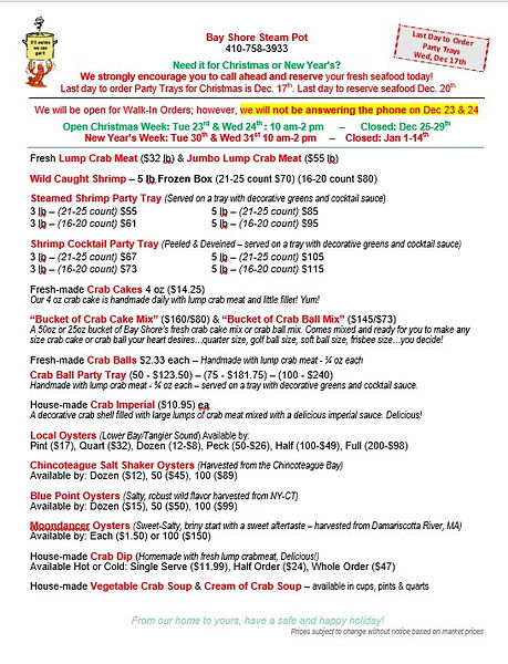 Chesapeake: 1/2 lb shrimp, 2 lobster tails, 1/2 doz clams, 1/2 lb mussels, 1/2 lb snow crab legs, 2 sausage links, corn, potatoes & onion $76